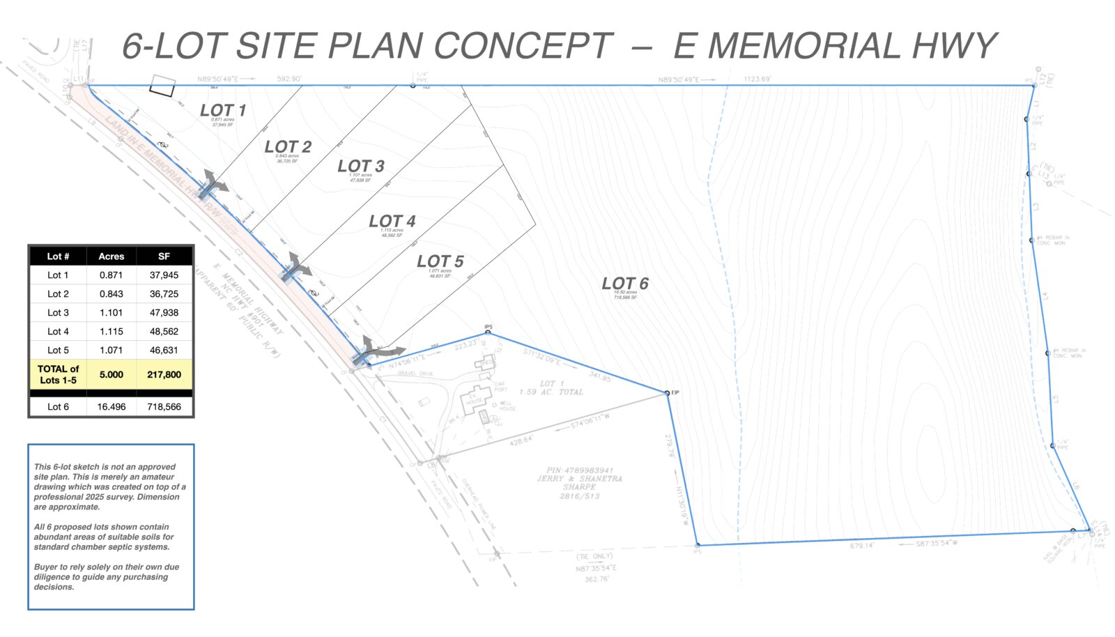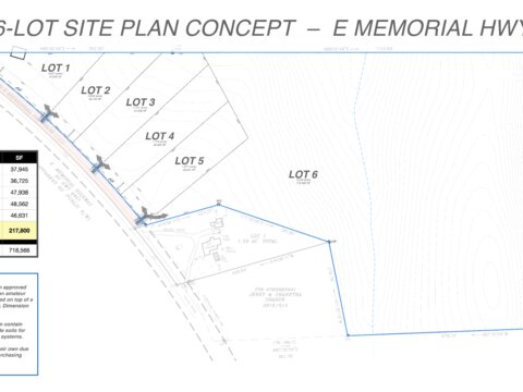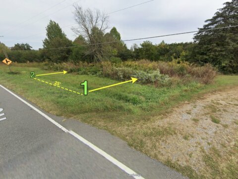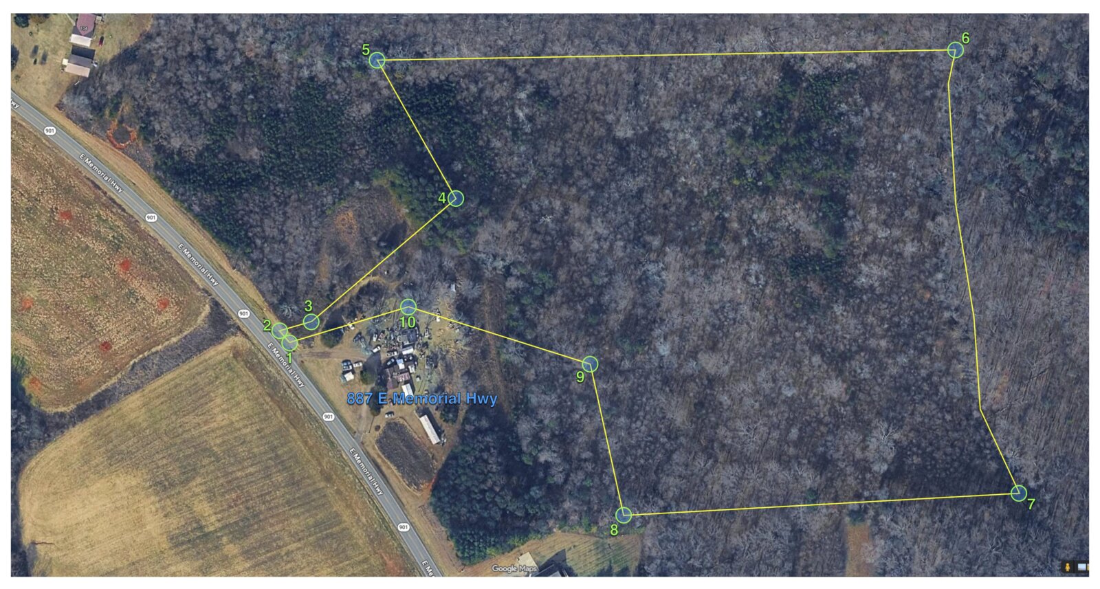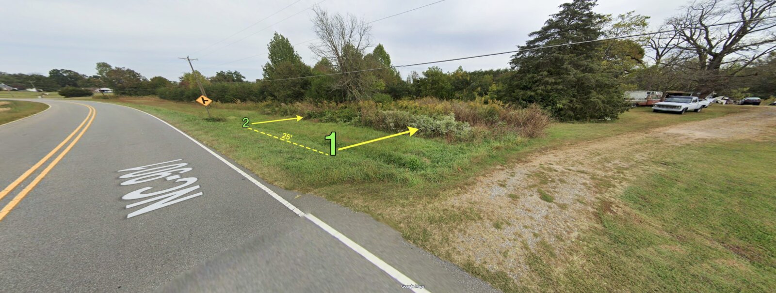 Here’s where to park your car and start the walking journey, which is where points 1 and 2 will be. This is approximately where the 25’ wide entrance should be, which is between the northern-most driveway of 887 E Memorial Hwy, and the yellow metal sign shown in this image: